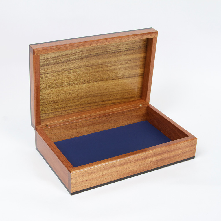 The box sides are made from solid Tasmanian Blackwood, with the lid panels available in various Australian timbers: Blackheart Sassafras, Fiddleback Eucalypt, Fiddleback Blackwood, Burl Eucalypt, Burl Myrtle.